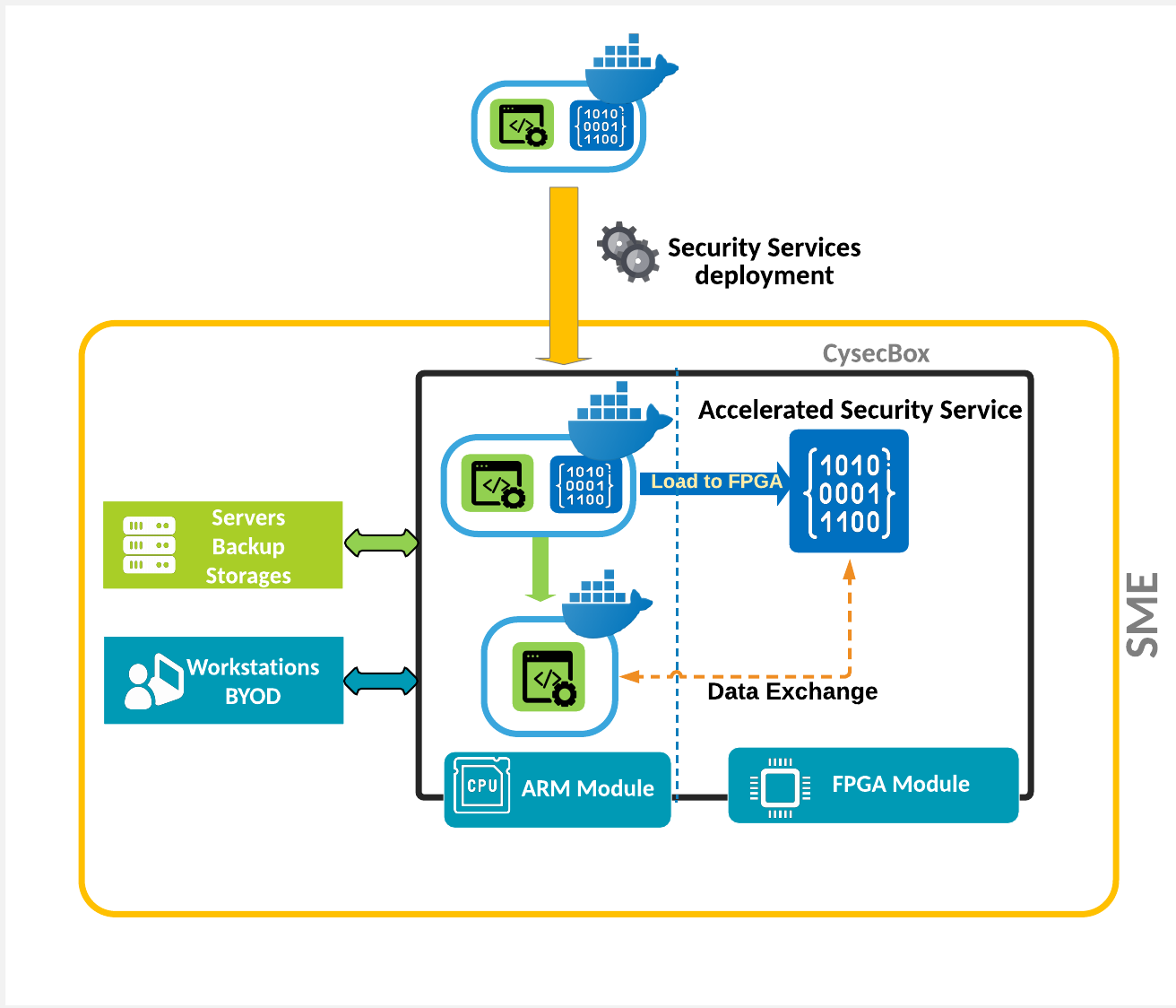 CYsecBox targets mainly SMEs in-premise security. CYsecBox is a low-cost and low-power solution providing a resource capable hosting environment for the acceleration of: